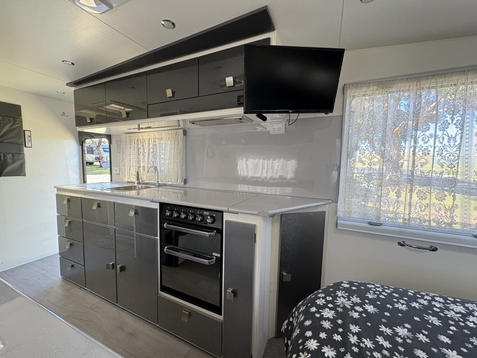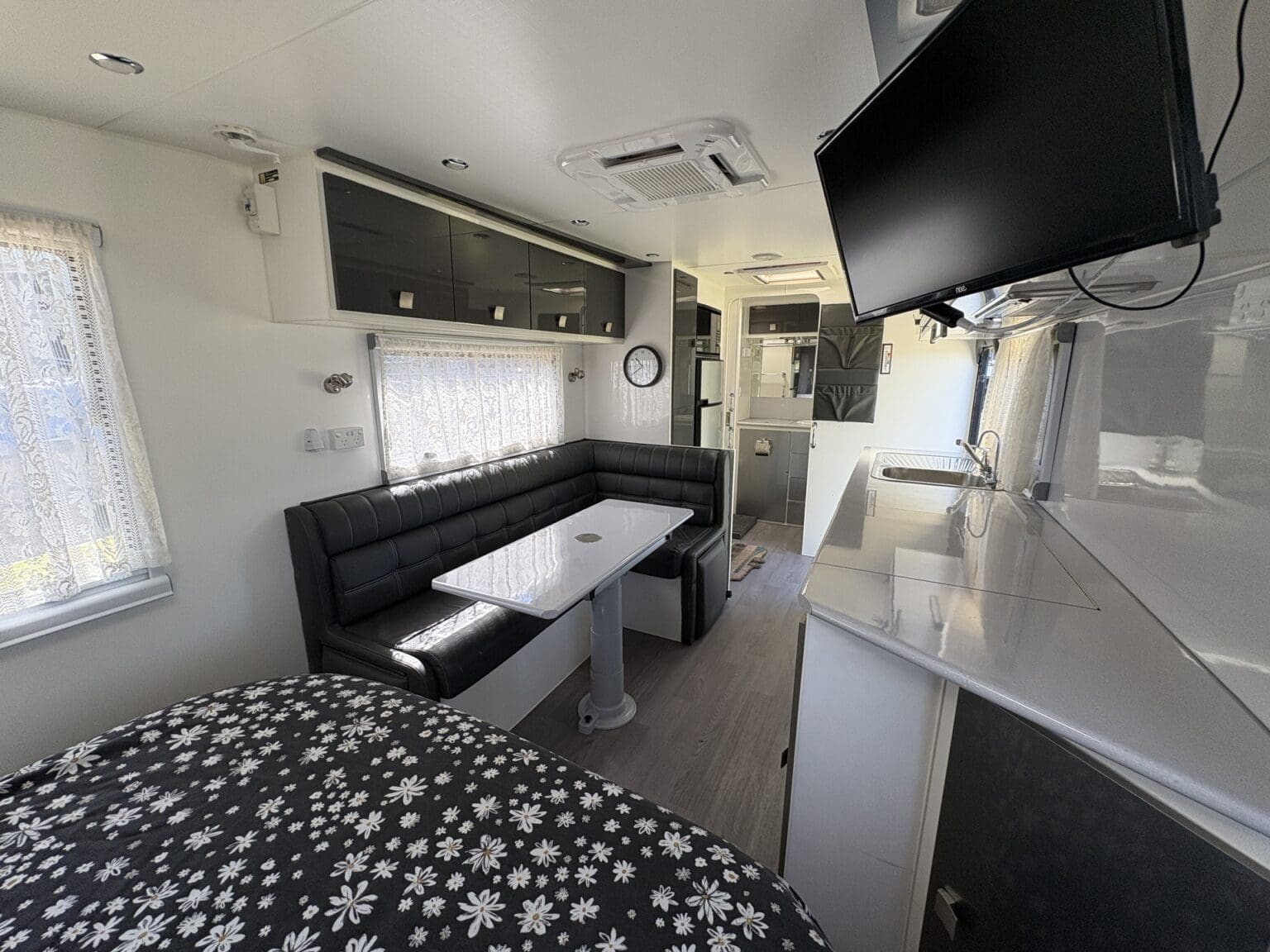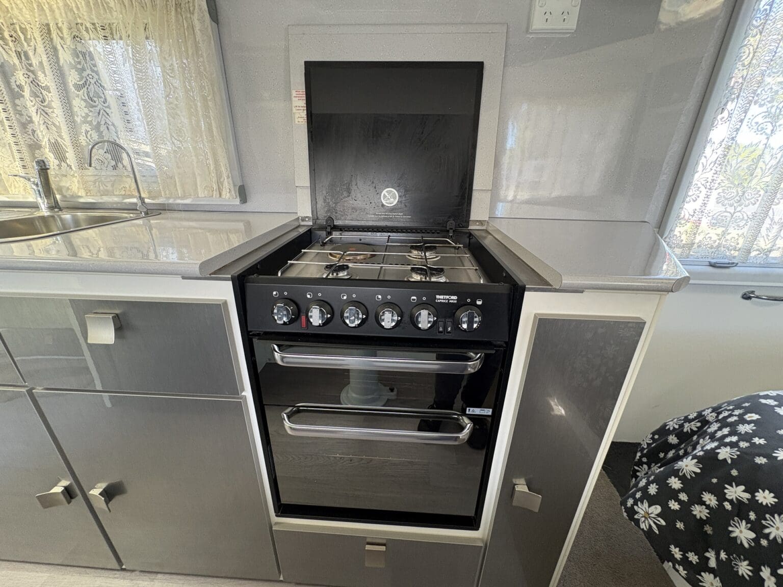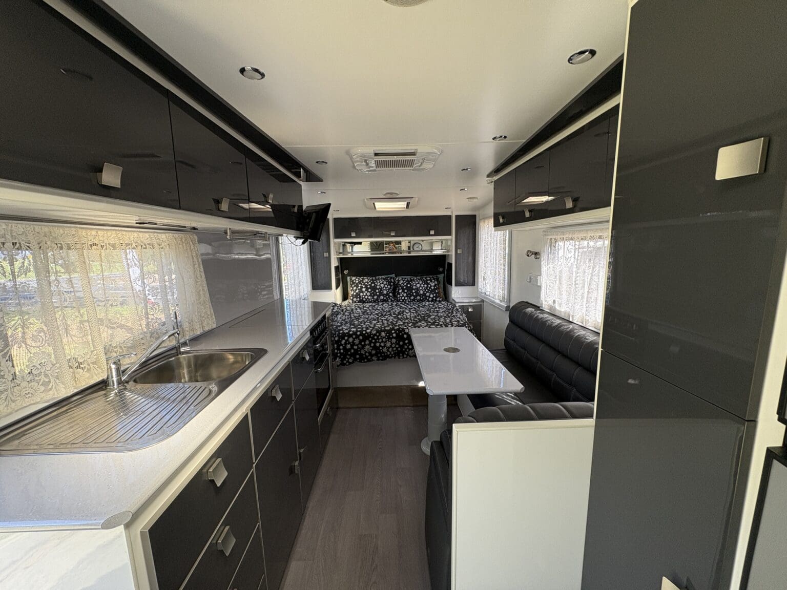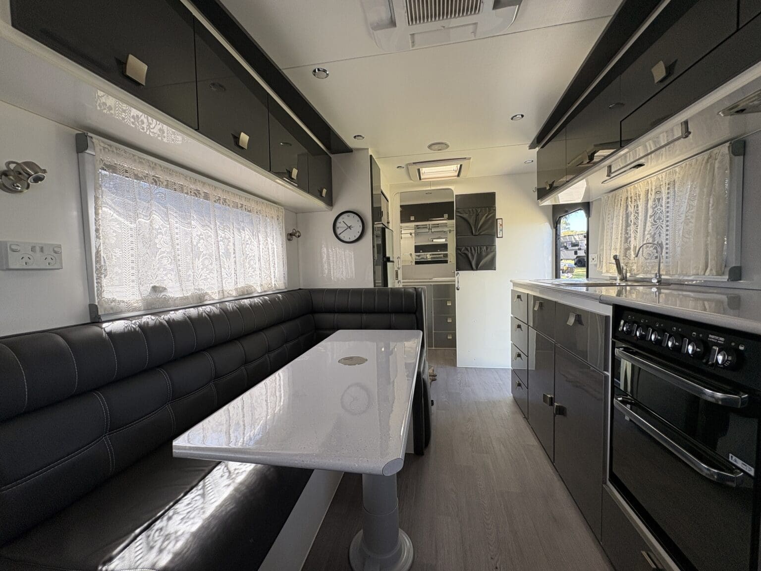 NICELY APPOINTED TOURING VAN THAT’S READY TO HEAD OFF IN STYLE WITH ALL THE HOME COMFORTS OF A SEPARATE SHOWER AND TOILET, ISLAND BED, ‘L’ SHAPE LOUNGE WITH FOOTRESTS – CONVERTS TO AN EXTRA BED, COOKING – WITH A FULL OVEN, MICROWAVE, FRIDGE, AIRCON, TV, WASHING MACHINE, ROOFTOP SOLAR AND FOR YOUR SAFETY ITS FITTED WITH ALKO ELECTRONIC SWAY CONTROL……WELL WORTH A LOOK!!
