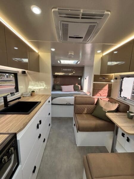 Step into luxury and innovation with the Royal Flair Piazza 21′ – 1, designed to redefine what it means to explore Australia in style. With its extended deck, café-style seating, and off-grid capabilities, this 21-foot caravan brings modern sophistication and robust functionality to the road.