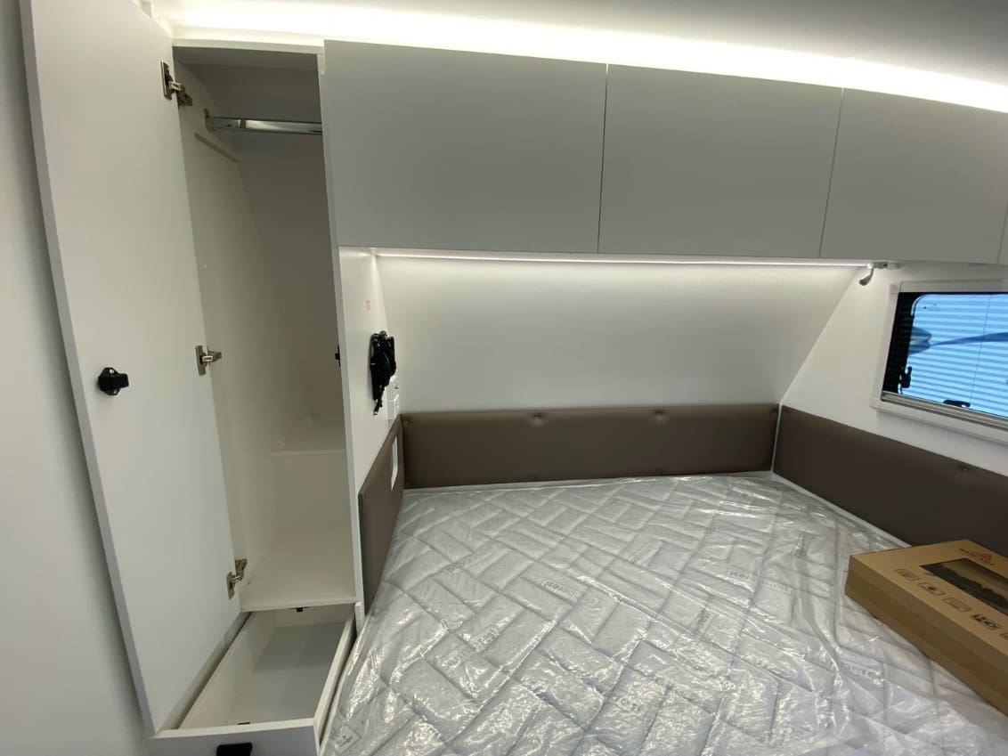 Clever storage solutions, including a large under-bed drawer and overhead cabinets.