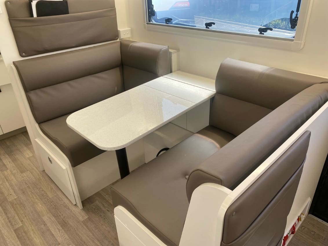 A full-through front tunnel boot and a side picnic table with integrated lighting.