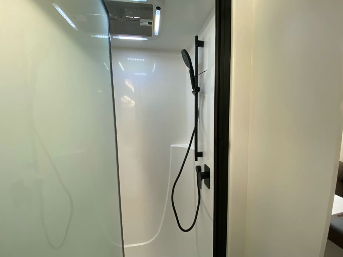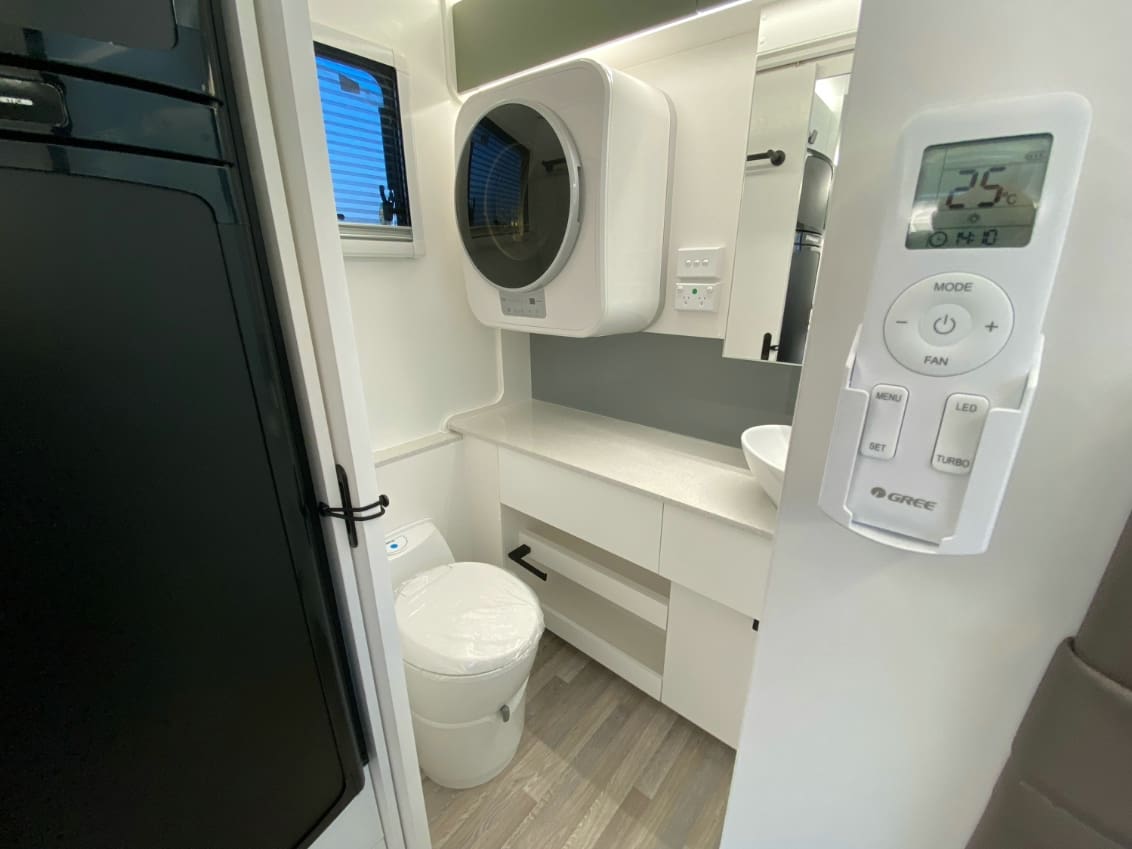Fully equipped ensuite with a solid sliding door, mirrored vanity, and cassette toilet.