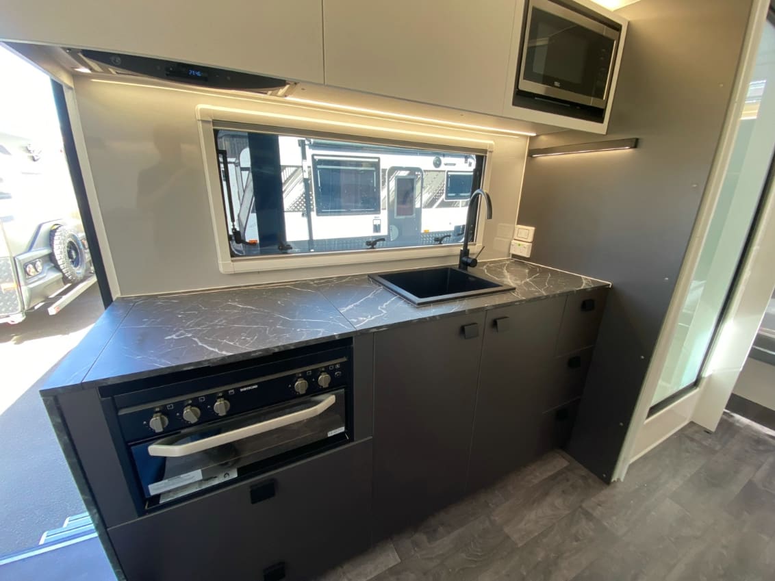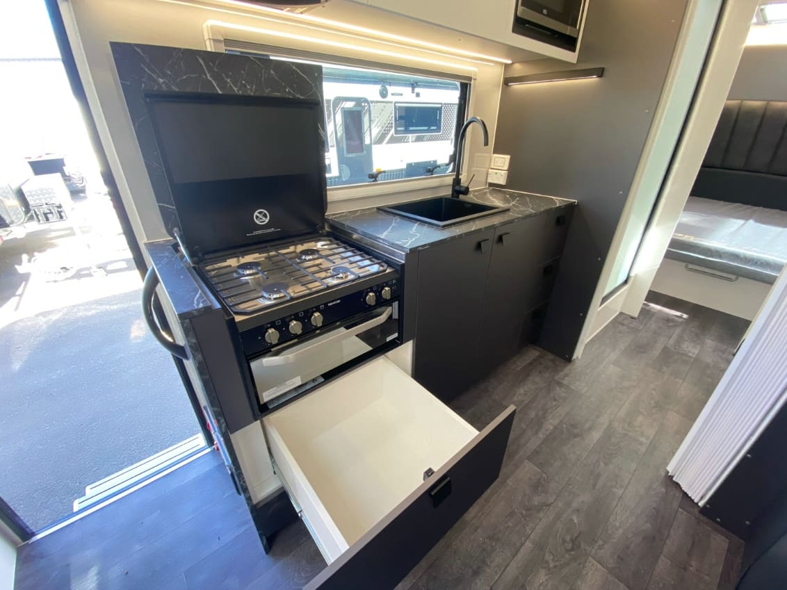 You’ll also find a recessed cooktop for better bench space, a 199L 3-way fridge/freezer, and an instant hot water system — all working together to create a seamless touring experience.